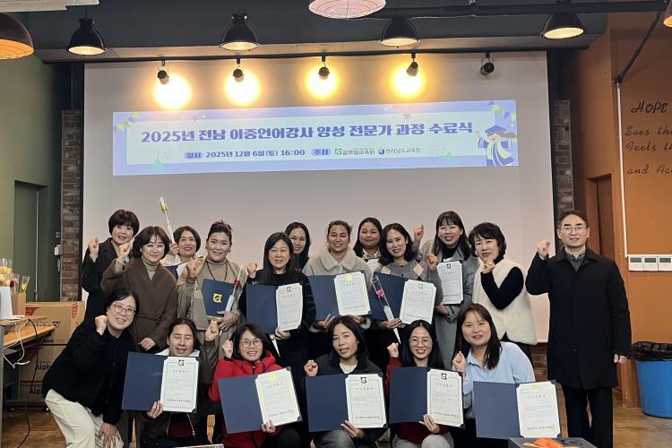 ÀÌ¿Í °ü·Ã, Àü³²±³À°Ã»Àº ¡®2025 Àü¶ó³²µµ ÀÌÁß¾ð¾î°»ç Àü¹®°¡ °úÁ¤ ¿¬¼ö¡¯¸¦ 11¿ù 15ÀϺÎÅÍ ¿î¿µÇϰí, Áö³ 12¿ù 6Àϰú 7ÀÏ Àü³²´ëÇб³ ¿©¼öÄ·ÆÛ½º ±Û·Î¹ú±³À°¿ø¿¡¼ ¼ö·á½ÄÀ» ¿¾î ¿¬¼ö °úÁ¤À» ¸¶¹«¸®Çß´Ù.