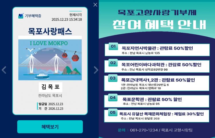¸ñÆ÷½Ã´Â °íÇâ»ç¶û±âºÎÁ¦ Âü¿©ÀÚ¿¡°Ô °ü±¤¡¤¹®È½Ã¼³ÀÇ ÀÌ¿ë¿ä±ÝÀ» ÇÒÀÎÇÏ´Â ¡®¸ñÆ÷»ç¶ûÆÐ½º¡¯¸¦ ¹ß±ÞÇÑ´Ù°í Áö³ÇØ 12¿ù 30ÀÏ ¹àÇû´Ù.