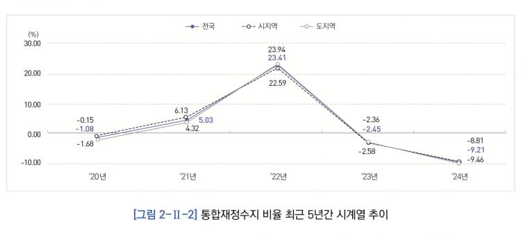 Áö¹æ±³À°ÀçÁ¤ÀÇ °ÇÀü¼ºÀ» ³ªÅ¸³»´Â ÅëÇÕÀçÁ¤¼öÁö(ÅëÇÕÀçÁ¤¼öÀÔ-ÅëÇÕÀçÁ¤ÁöÃâ) ºñÀ²ÀÌ 2024³â µé¾î ´ëÆø °¨¼ÒÇØ -9.21%¸¦ ±â·ÏÇÑ °ÍÀ¸·Î ³ªÅ¸³µ´Ù.