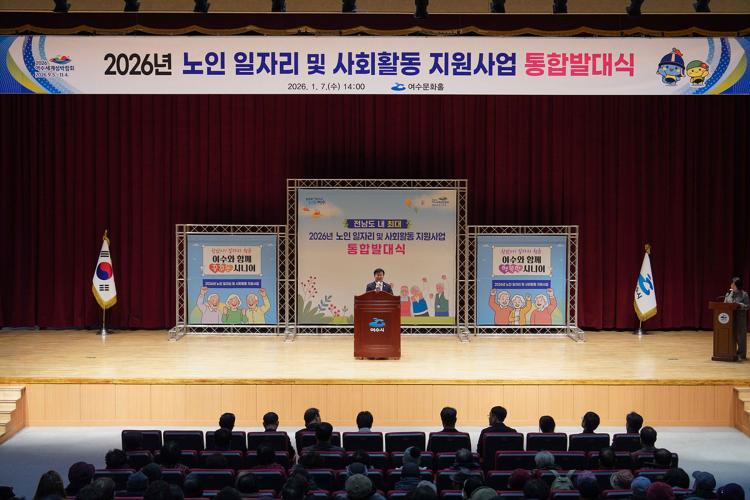 ¿©¼ö½Ã´Â Áö³ 7ÀÏ, ¿©¼ö¹®ÈȦ¿¡¼ ¡®2026³â ³ëÀÎ ÀÏÀÚ¸® ¹× »çȸȰµ¿ Áö¿ø»ç¾÷ ÅëÇչߴë½Ä¡¯À» °³ÃÖÇß´Ù. À̳¯ ¹ß´ë½Ä¿¡´Â ¿©¼ö½Ã´Ï¾îŬ·´ µî 8°³ ¼öÇà±â°ü ±â°üÀ塤Á¾»çÀÚ ¹× ³ëÀÎ ÀÏÀÚ¸® »ç¾÷¿¡ Âü¿©ÇÏ´Â ¾î¸£½Å µî 450¿© ¸íÀÌ Âü¼®ÇØ ÀÚ¸®¸¦ ºû³Â´Ù.