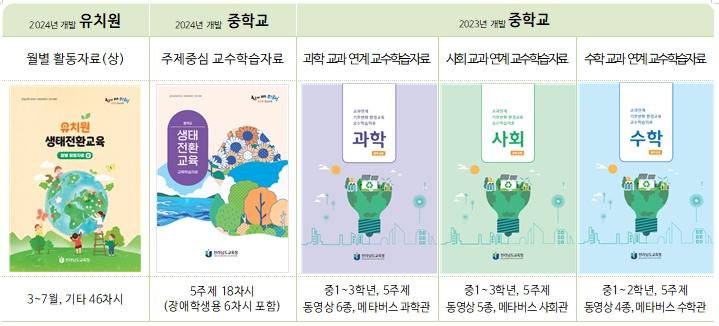 Àü¶ó³²µµ±³À°Ã»Àº ±âÈÄÀ§±â ´ëÀÀ°ú »ýÅÂÀüȯ±³À° °È¸¦ À§ÇØ À¯Ä¡¿øºÎÅÍ °íµîÇб³±îÁö Çб³±Þº° ¸ÂÃãÇü ÀÚ·á °³¹ß¿¡ ÁÖ·ÂÇϰí ÀÖ´Ù. 2023³âºÎÅÍ ¿ÃÇØ±îÁö ÃÑ 15Á¾ÀÇ ´Ü°èº° ÀڷḦ °³¹ßÇØ ¿ÔÀ¸¸ç, ¿ÃÇØ´Â ÇöÀå ±³»çµéÀÌ 1³â°£ Çб³¿¡¼ ½ÇõÇÑ »ýÅÂÀüȯ±³À° ¿¬±¸ ¼º°ú¸¦ ¹ÙÅÁÀ¸·Î ¡®»ýÅÂÀüȯ±³À° ±³¼ö¡¤ÇнÀ ÀÚ·á 5Á¾¡¯À» ¿Ï¼ºÇß´Ù.