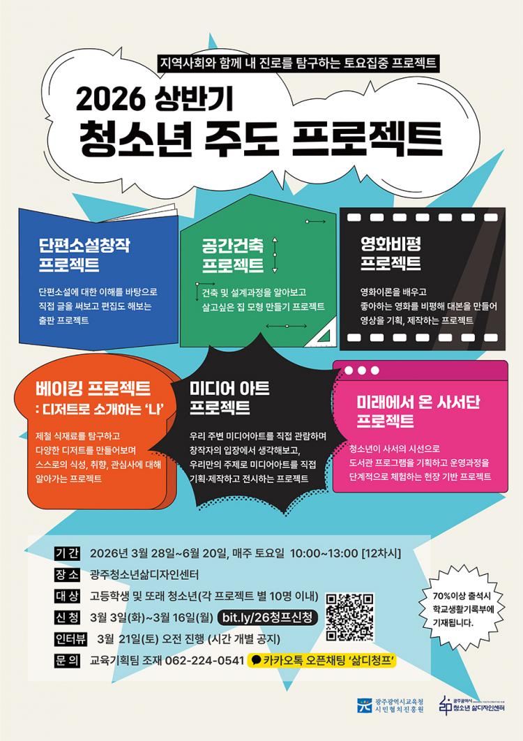 ¡®Ã»¼Ò³â ÁÖµµ ÇÁ·ÎÁ§Æ®¡¯´Â ½Ã¹ÎÇùÄ¡ÁøÈï¿ø°ú ±¤ÁÖû¼Ò³â»îµðÀÚÀμ¾ÅͰ¡ û¼Ò³âµéÀÌ Çб³ ¹Û Àü¹®°¡¿Í ÇÔ²² ´Ù¾çÇÑ ºÐ¾ß¸¦ °æÇèÇÏ¸ç ½º½º·Î ¹Ì·¡¸¦ ¼³°èÇÒ ¼ö ÀÖµµ·Ï µ½±â À§ÇØ Áö³ 2020³âºÎÅÍ ¿î¿µÇϰí ÀÖ´Ù.