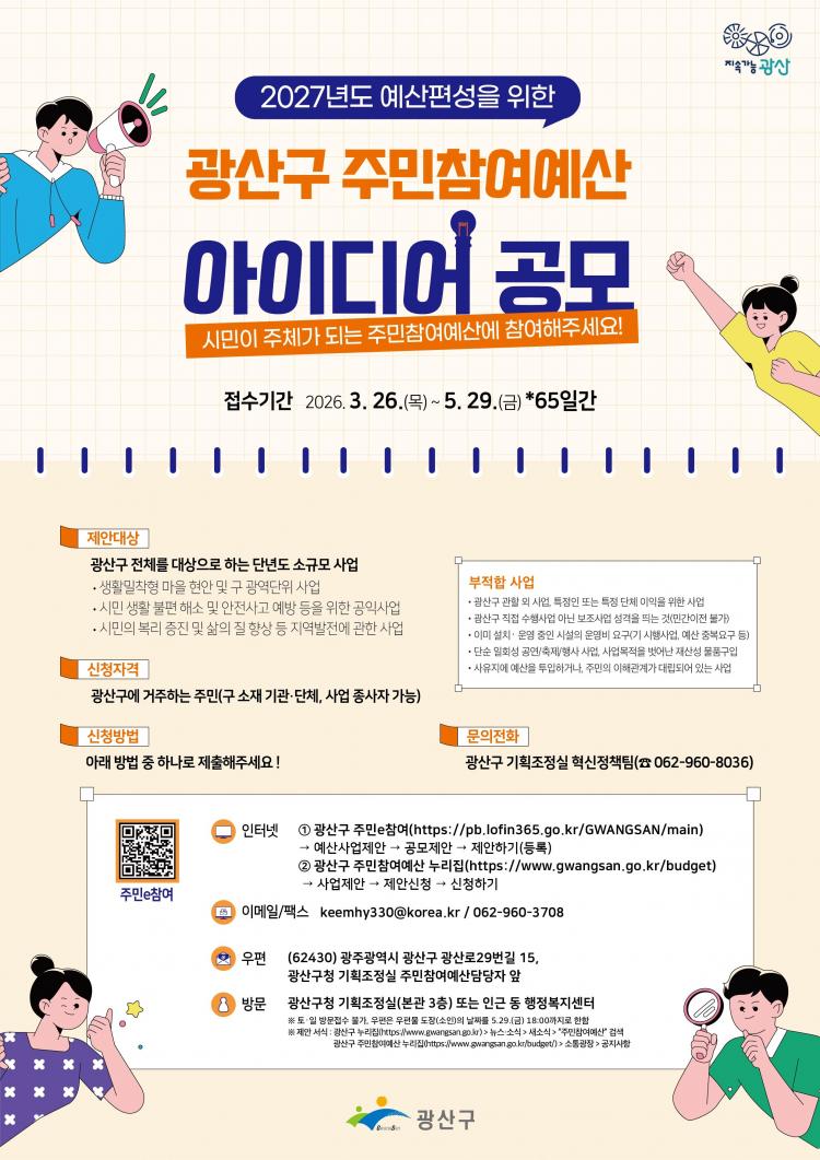 °ø¸ð ±â°£Àº 5¿ù 29ÀϱîÁö´Ù. ±¤»ê±¸´Â Á¢¼öµÈ Á¦¾È¿¡ ´ëÇØ °ü·Ã ºÎ¼ÀÇ »ç¾÷ Ÿ´ç¼º °ËÅä, ÁÖ¹ÎÂü¿©¿¹»êÀ§¿øÈ¸ÀÇ ½É»ç¸¦ °ÅÃÄ 10¿ù Áß ³»³â ¿¹»ê¾È¿¡ ¹Ý¿µÇÒ »ç¾÷À» ¼±Á¤ÇÒ °èȹÀÌ´Ù. ¼±Á¤µÈ ÁÖ¹ÎÂü¿©¿¹»ê »ç¾÷Àº ±¤»ê±¸ÀÇȸ ¿¹»ê ½ÉÀǸ¦ ÅëÇØ 2027³âµµ º»¿¹»ê Æí¼º ¿©ºÎ°¡ °áÁ¤µÈ´Ù.
