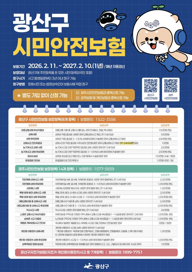 ±¤»ê±¸ ½Ã¹Î¾ÈÀüº¸ÇèÀº µî·Ï ¿Ü±¹ÀÎÀ» Æ÷ÇÔÇØ ±¤»ê±¸¿¡ Áֹεî·ÏÀ» µÐ ¸ðµç ½Ã¹ÎÀÌ º°µµÀÇ °¡ÀÔ ÀýÂ÷ ¾øÀÌ ÀÚµ¿ °¡ÀԵȴÙ. º¸Çè·á´Â Àü¾× ±¤»ê±¸°¡ ºÎ´ãÇÑ´Ù.