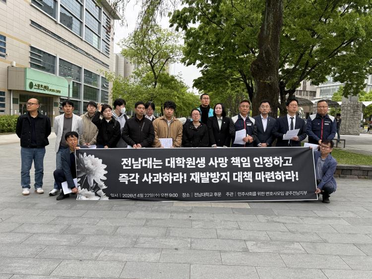 ¹ÎÁÖ³ëÃÑ ±¤ÁÖº»ºÎ¡¤¹ÎÁÖ»çȸ¸¦ À§ÇÑ º¯È£»ç ¸ðÀÓ ±¤ÁÖÀü³²ÁöºÎ µî Áö¿ª ½Ã¹Î»çȸ´Üü¿Í ³ëµ¿Á¶ÇÕÀº 22ÀÏ ¿ÀÀü ±¤ÁÖ ºÏ±¸ Àü³²´ëÇб³ ÈĹ®¿¡¼ ±âÀÚȸ°ßÀ» ¿¾î ¡°±Ù·Îº¹Áö°ø´ÜÀÌ Áö³´Þ °í(ͺ) À̸𠿬±¸¿øÀÇ »ç¸ÁÀ» ¾÷¹«»ó ÀçÇØ·Î ÀÎÁ¤ÇÑ ¸¸Å, Àü³²´ë´Â ´õ ÀÌ»ó Ã¥ÀÓÀ» ȸÇÇÇØ¼´Â ¾È µÈ´Ù¡±°í ¹àÇû´Ù.