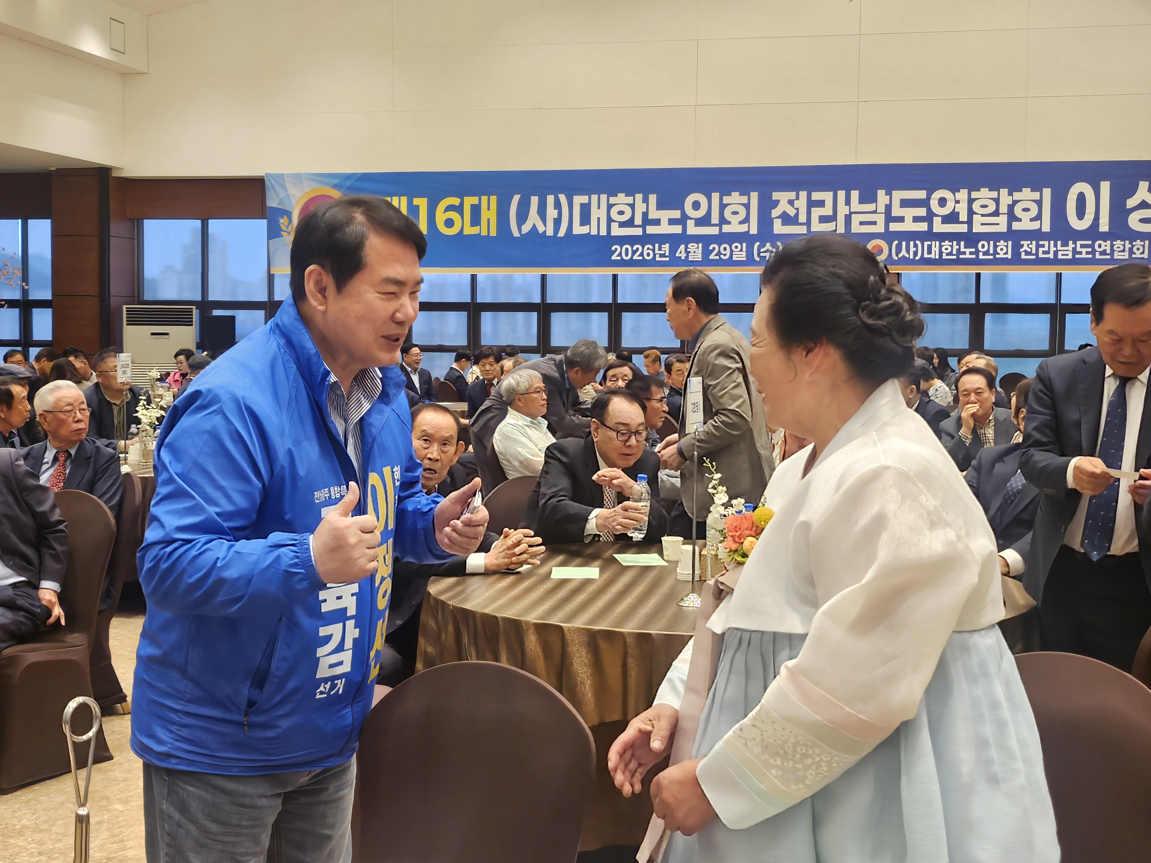 ÀÌÁ¤¼± Àü³²±¤ÁÖÆ¯º°½Ã ±³À°°¨ ¿¹ºñÈ帰¡ 29ÀÏ Á¦16´ë ´ëÇѳëÀÎȸ Àü³²µµ¿¬ÇÕȸÀå ÃëÀÓ½ÄÀå¿¡¼ Âü¼®ÀÚµé°ú Àλ縦 ³ª´©°í ÀÖ´Ù.(ÀÌÁ¤¼±Èĺ¸ Á¦°ø)
