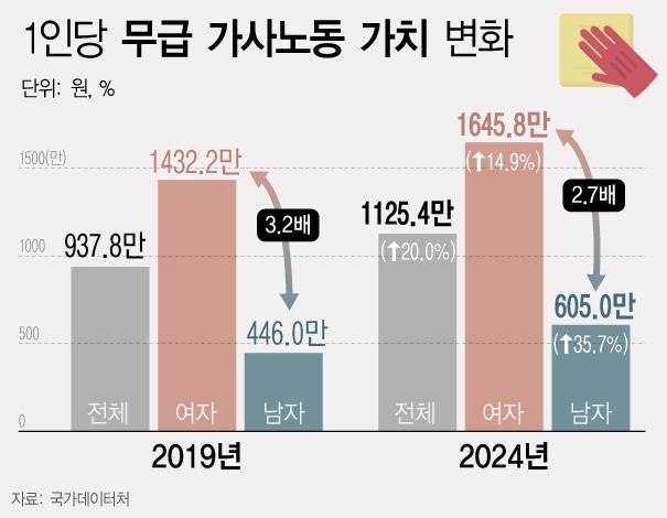 ±¹°¡µ¥ÀÌÅÍó°¡ 29ÀÏ ¹ßÇ¥ÇÑ ¡®2024³â °¡°è»ý»ê À§¼º°èÁ¤¡¯(¹«±Þ °¡»ç³ëµ¿°¡Ä¡ Æò°¡)¿¡ µû¸£¸é, 2024³â ±âÁØ ±¹¹Î 1ÀÎ´ç ¿¬°£ ¹«±Þ °¡»ç³ëµ¿ÀÇ °¡Ä¡´Â 1125¸¸¿øÀ¸·Î 5³â Àü(2019³â)º¸´Ù 20.0% Áõ°¡Çß´Ù.